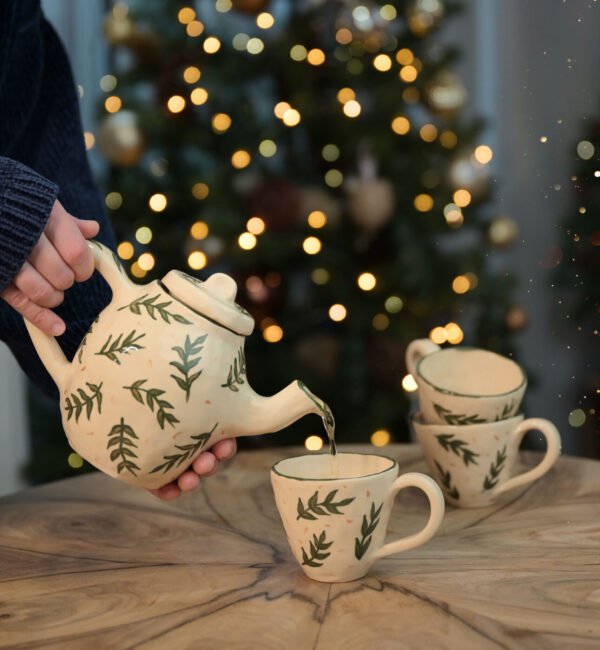 Îmbogățiți-vă momentele de răsfăț cu Setul Ceainic cu Ceșcuțe, un set rafinat și delicat, perfect pentru a adăuga un strop de eleganță oricărei case. Completat cu un ceainic și trei ceșcuțe, acest set este lucrat manual cu atenție, iar designul cu frunzulite pictate aduce o notă de natură și serenitate.