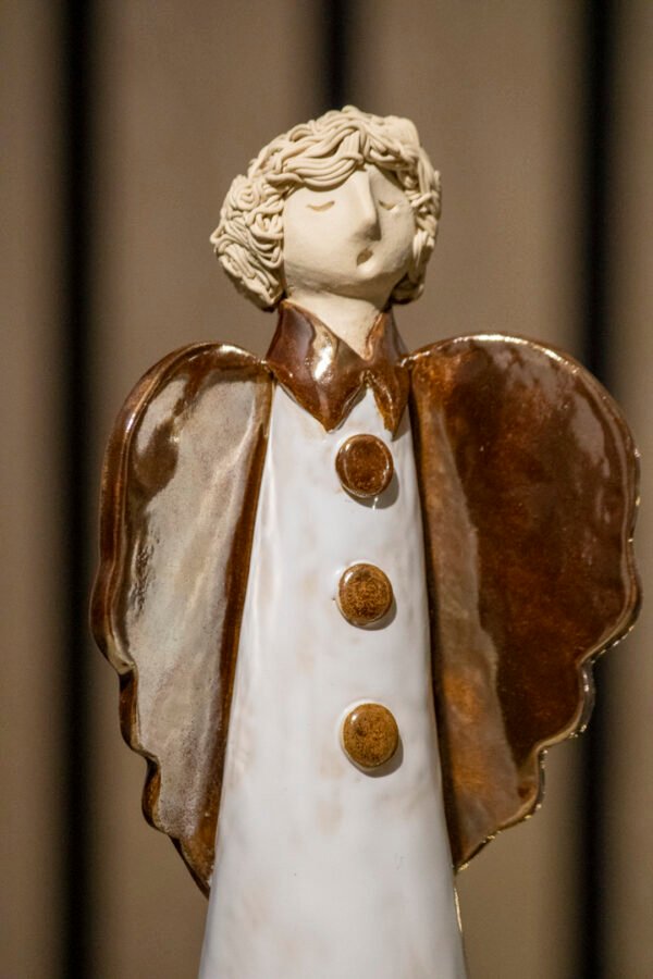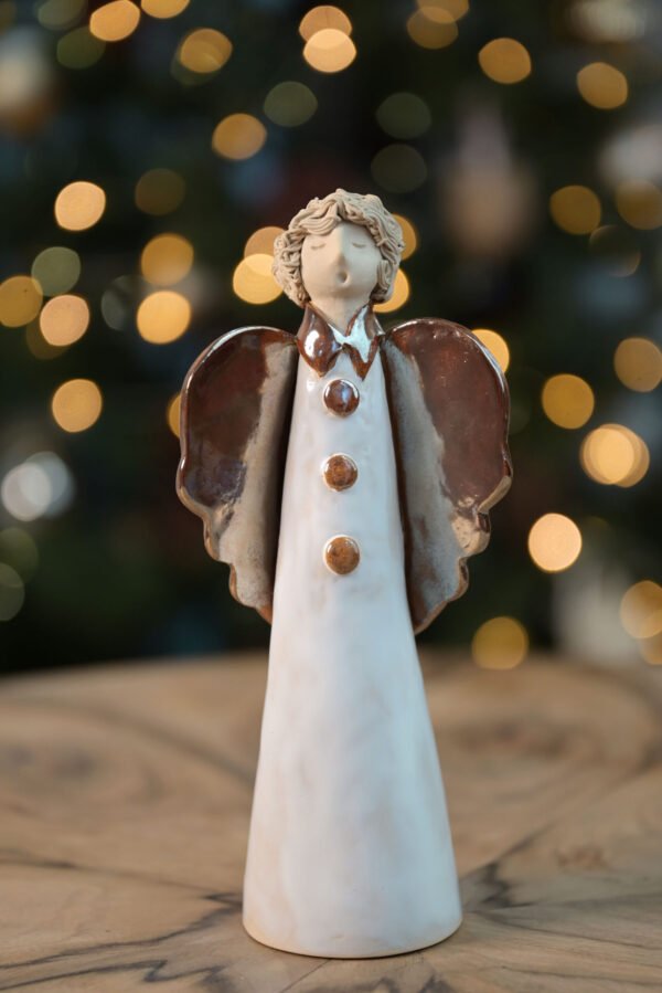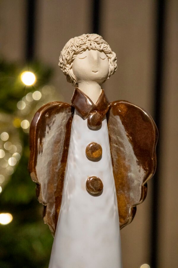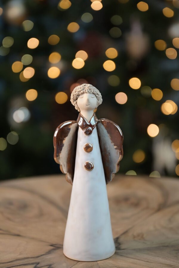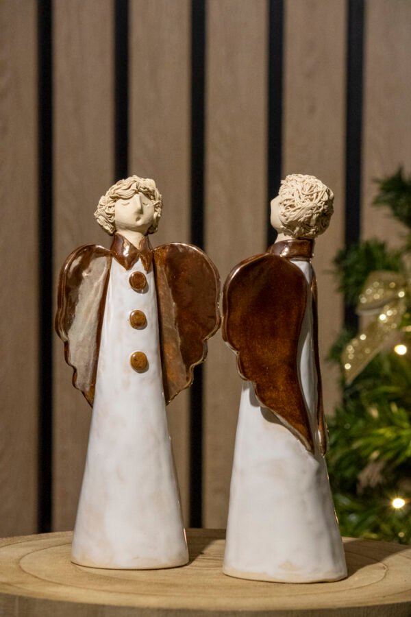 Împodobiți-vă casa cu această Statuetă Îngeraș, o piesă delicată și plină de farmec. Îngerașul este decorat cu o glazură albă pe corp, iar aripile bronz auriu adaugă un contrast elegant. Realizată manual din ceramică de calitate, această statueta aduce un aer de liniște și frumusețe în orice decor de sărbători.